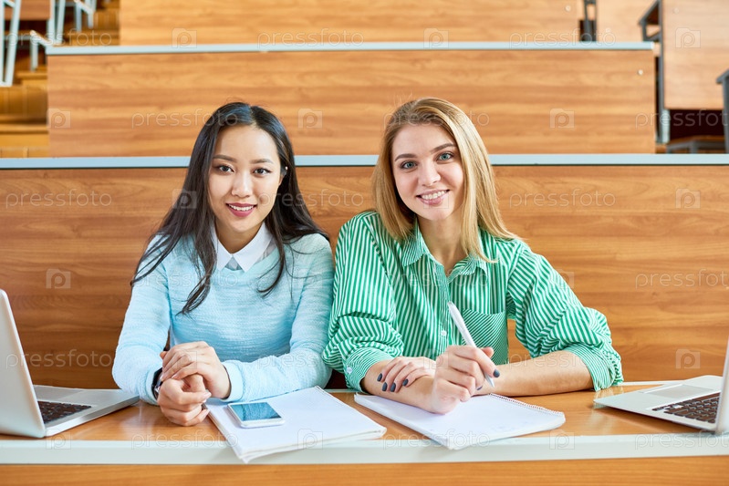Красивые женщины, позирующие в аудитории колледжа