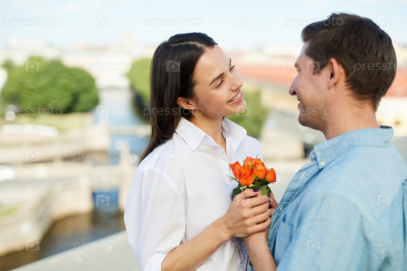 Счастливый мужчина дарит цветы своей девушке