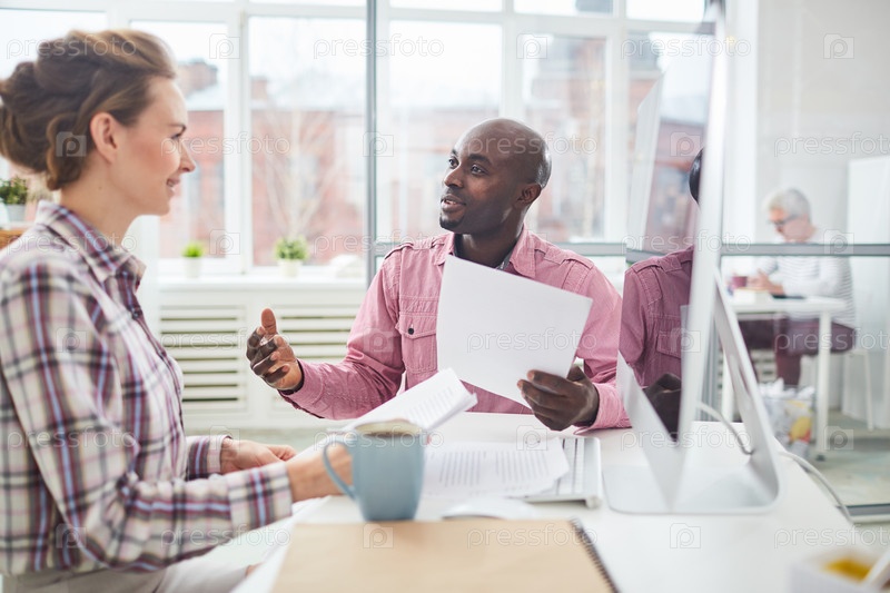 Коллеги по работе разговаривают в офисе