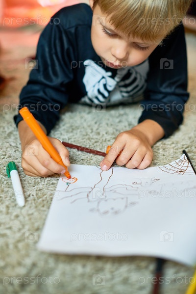 Маленький мальчик рисует картины на Хэллоуин