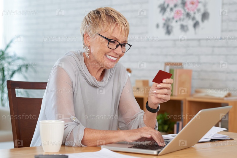 Joyful woman покупает онлайн