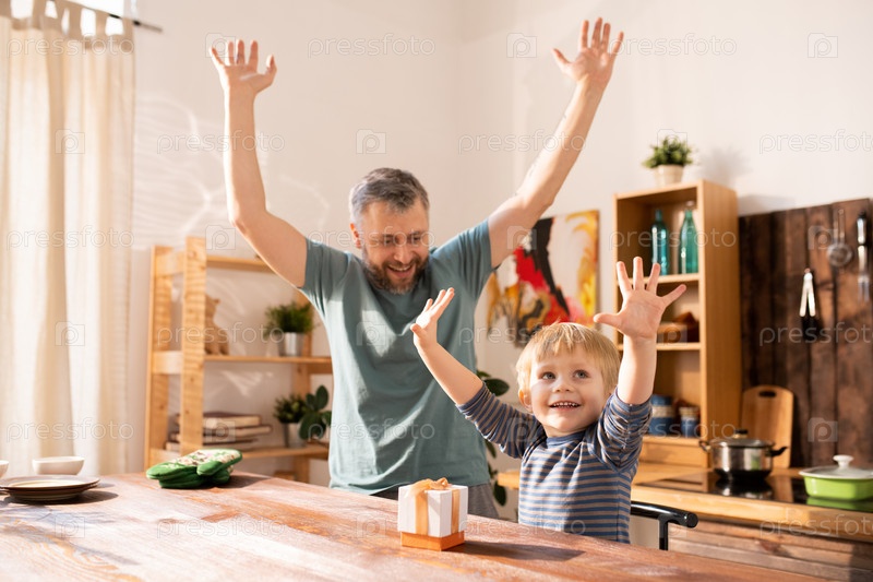 Взволнованные отец и сын наслаждаются упаковкой подарка