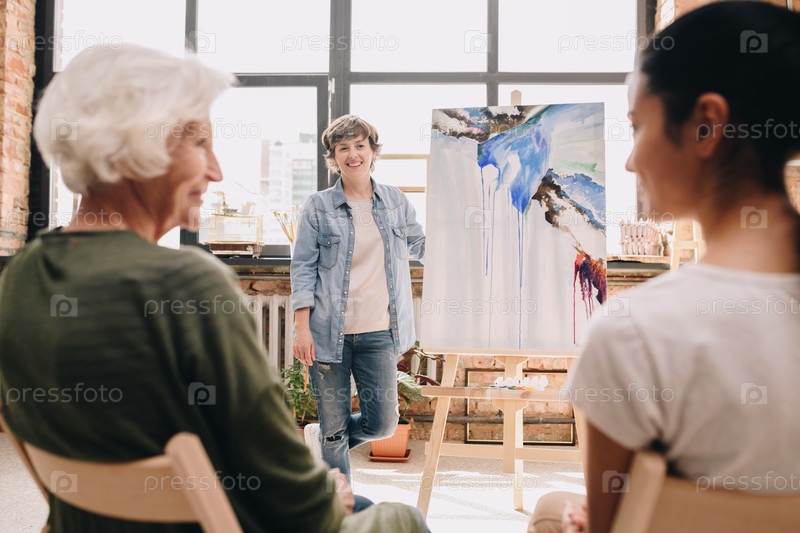 Художница-женщина, представляющая картину