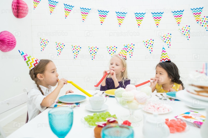 Веселые девушки, дующие в партийные рога
