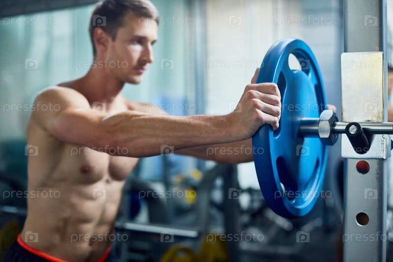 Сильный мужчина собирает штангу в тренажерном зале