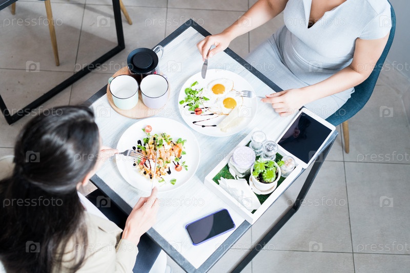 Две женщины наслаждаются едой в кафе