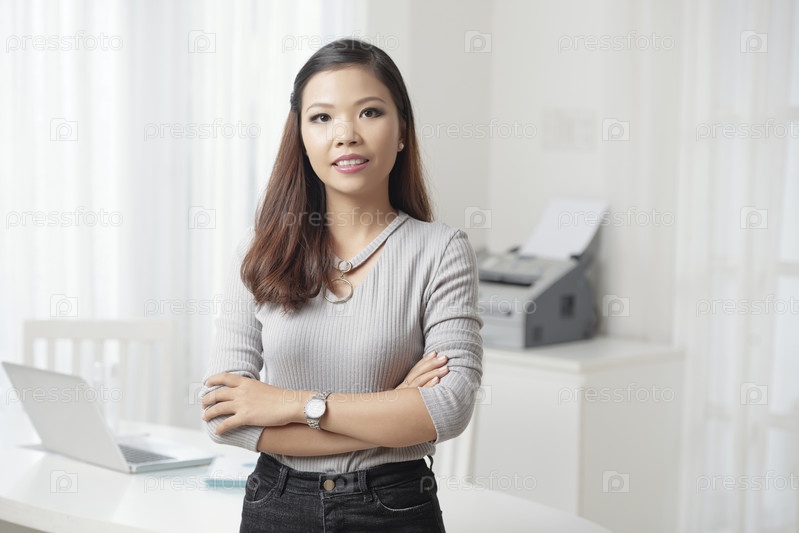 Современная молодая бизнесвуменка смотрит на камеру