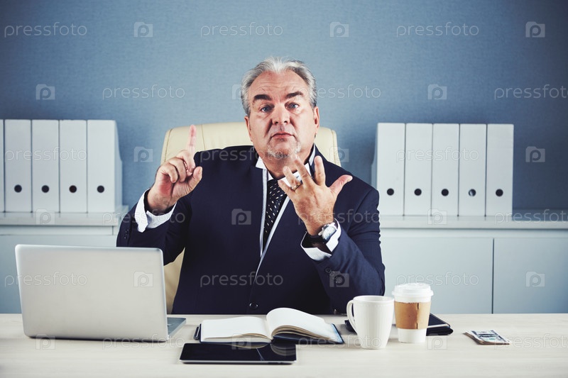 Серьезный пожилой бизнесмен объясняет, используя руки