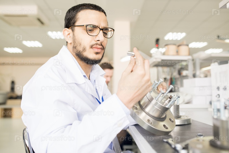Концентрированный арабский инженер просматривает детали технического оборудования