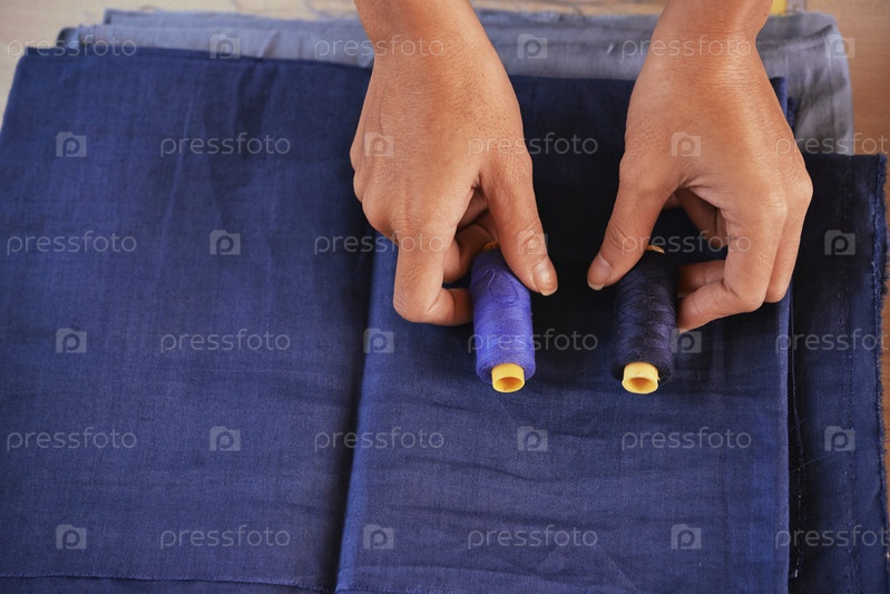 Рыбные руки выбирают нить для ткани