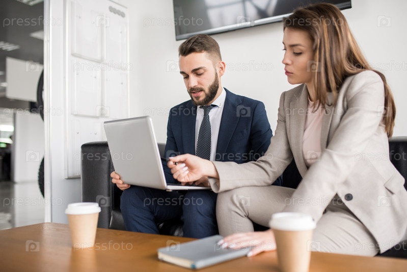 Успешная бизнес-пары работают с ноутбуком