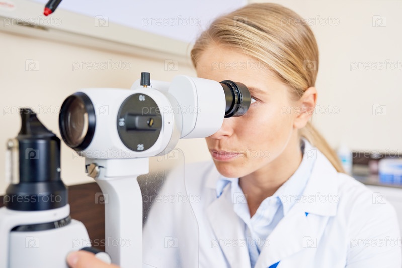 Женщина-офтальмолог смотрит на лампу с разрезом