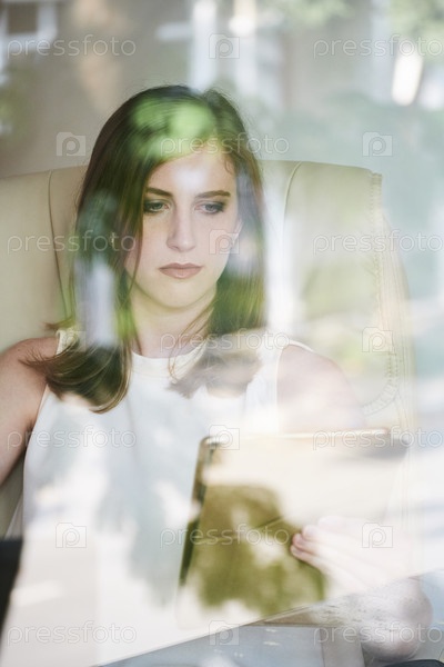 Молодая бизнесвуменка смотрит на планшет в офисе