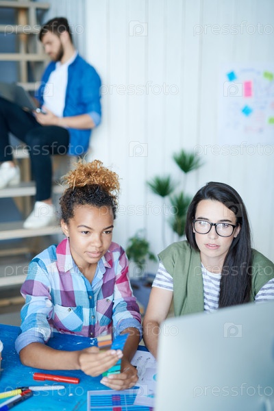 Две креативные молодые женщины, работающие с компьютером