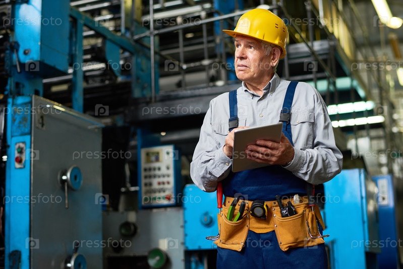 Старший фабричный работник, использующий планшет