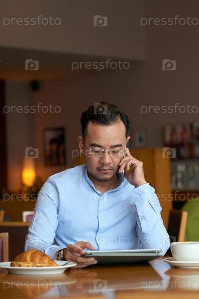Предприниматель читает данные на планшете
