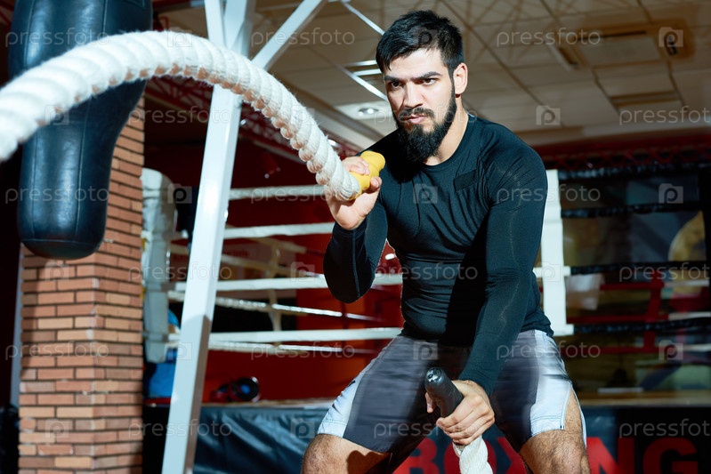 Брутальный спортсмен качает веревки в тренажерном зале
