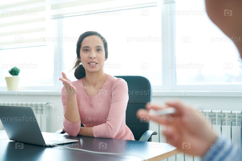 Энтузиастическая бизнес-леди обсуждает повестку дня с коллегой