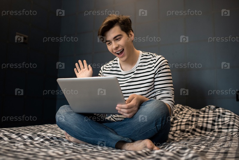 Счастливый молодой человек сидит на кровати, используя ноутбук