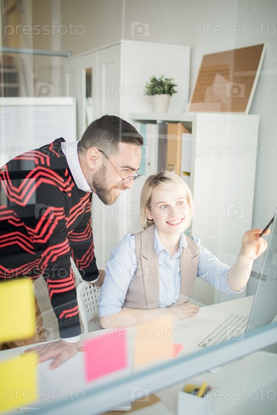 Позитивные коллеги обсуждают маркетинговый проект в офисе