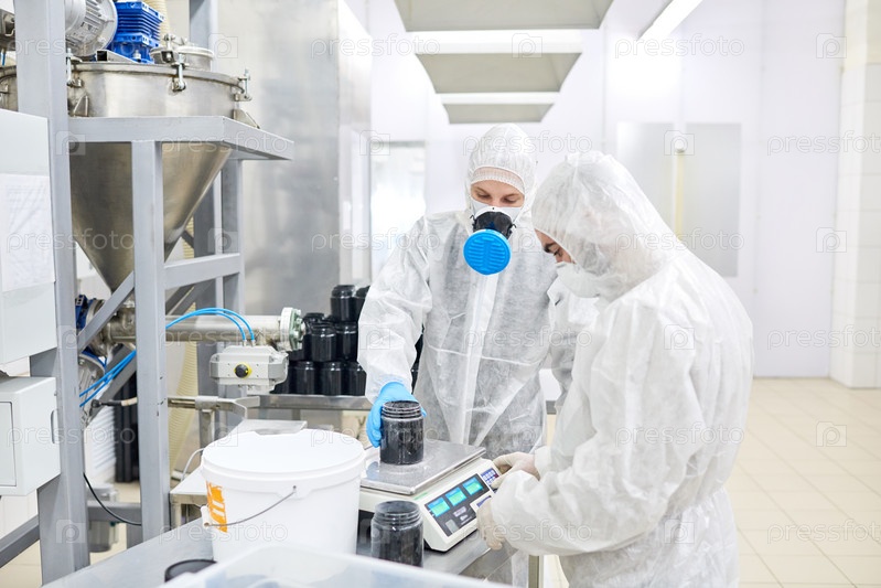 Фабричные рабочие взвешивают пластиковый контейнер с продуктом