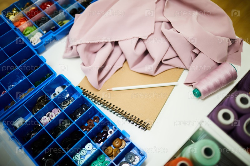 Кнопки и катушка из нитей на столе портного