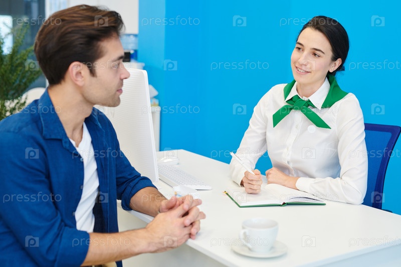 Улыбающаяся леди-консультант общается с клиентом