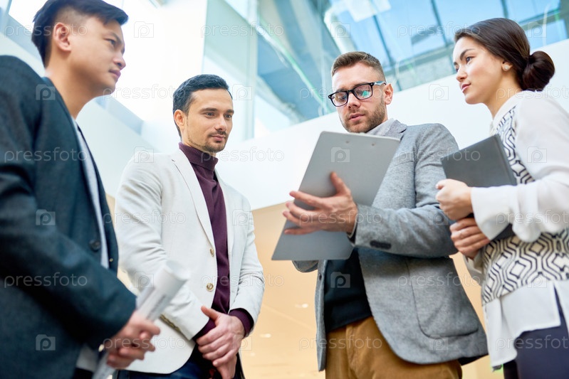Молодые бизнесмены обсуждают работу