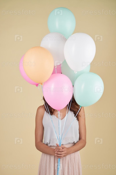 Стильная девушка прячется за кучей воздушных шаров