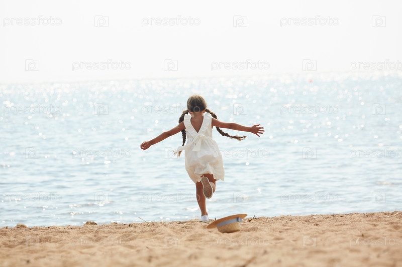 Маленькая девочка, бегущая к морю Счастливая