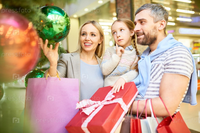 Очаровательная семья под рождественской елкой в торговом центре
