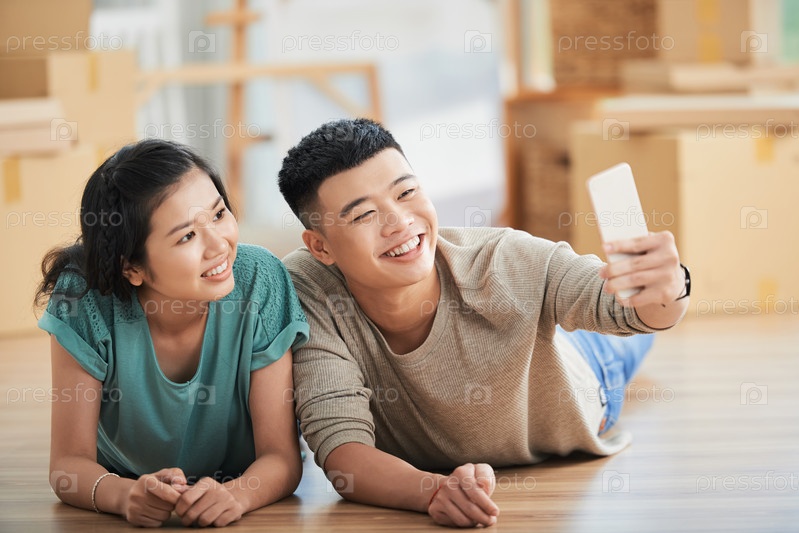 Пара, делающая селфи на новом этаже квартиры