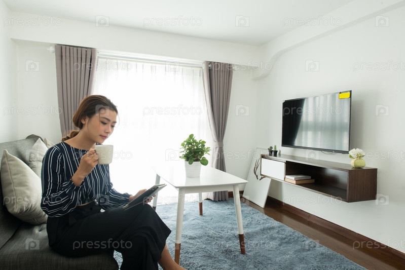 Серьезная азиатская девушка читает книгу на планшете