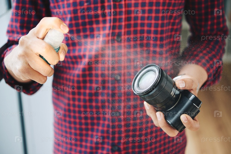 Мужчина опрыскивает объектив камеры жидкостью