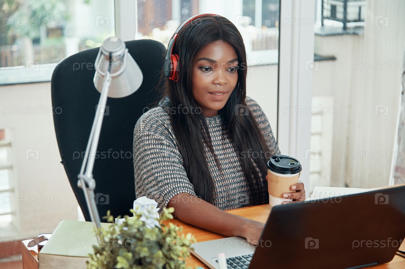 Черная женщина в наушниках, работающая на ноутбуке