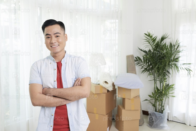 Улыбающийся мужчина со скрещенными руками в новой квартире