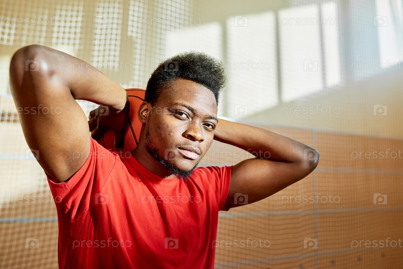 Мужчина держит баскетбольный мяч за головой