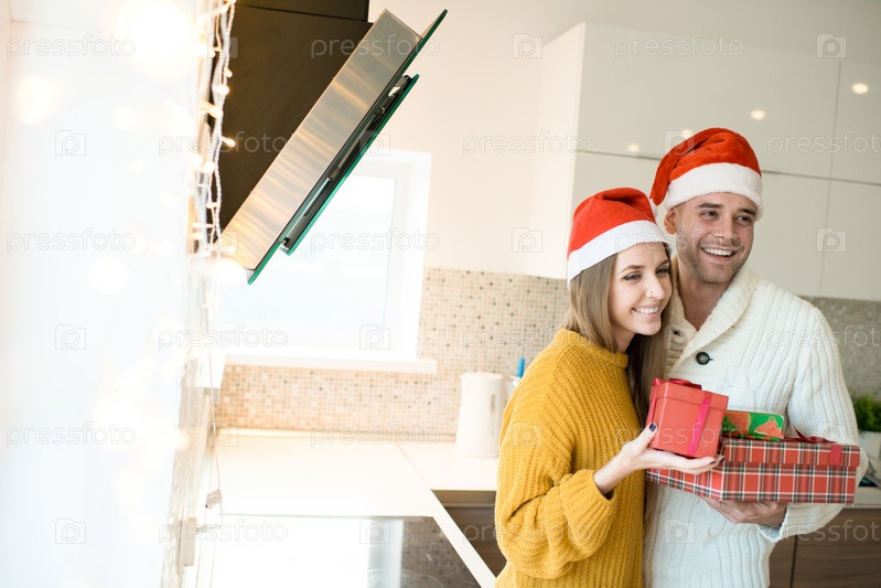 Счастливый мужчина и женщина с рождественскими подарками