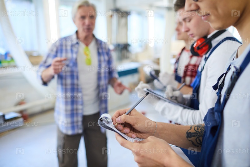 Молодые стажеры делают заметки, слушая плотника