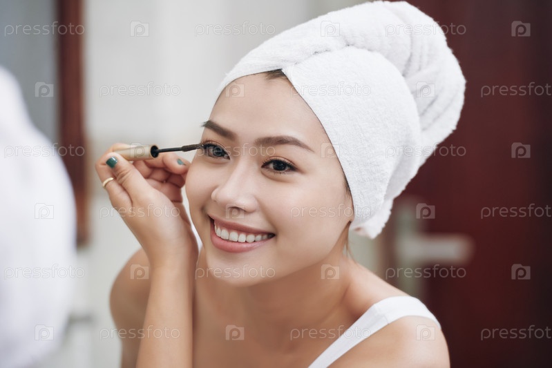 Улыбающаяся женщина наносит маскару в ванной