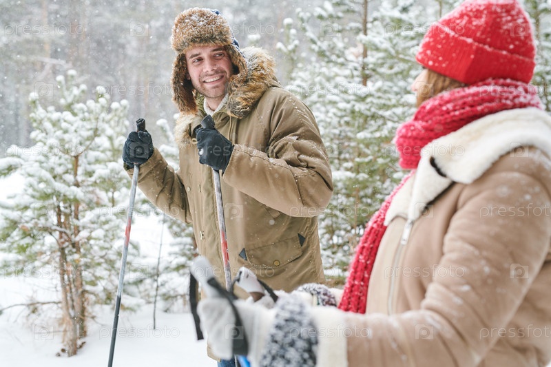 Счастливая пара катается на лыжах в лесу