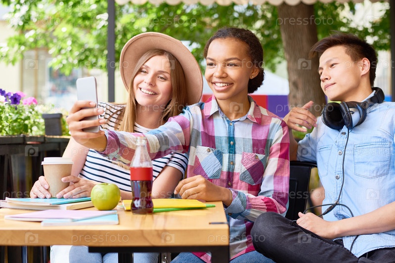 Молодые люди делают селфи в кафе