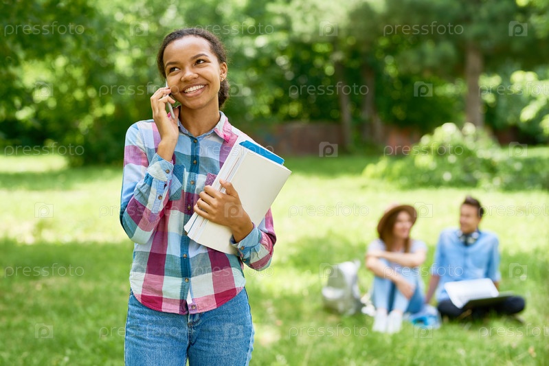 Веселый африканский студент разговаривает по телефону