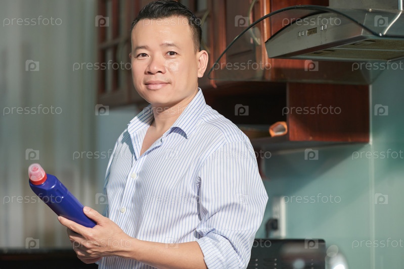 Мужчина, держащий моющее средство
