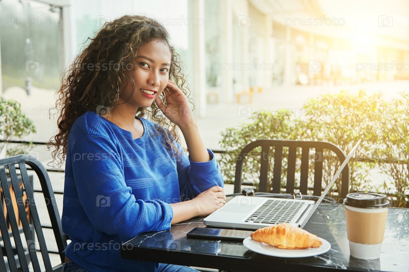 Индонезийская бизнесвумен с ноутбуком смотрит на камеру