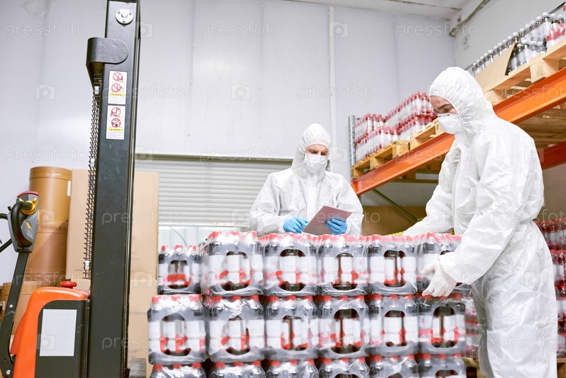Фабричные рабочие разгружают упаковки бутылок