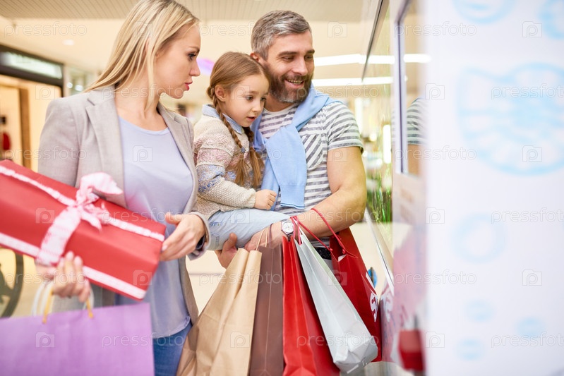 Взволнованная семья смотрит в окно торгового центра
