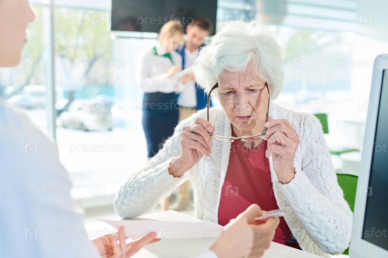 Сбитая с толку старшая леди изучает документ в банковском офисе