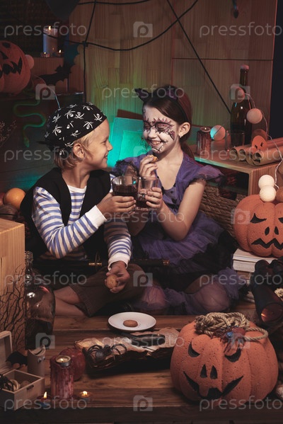 Дети, которые едят закуски на Хэллоуин