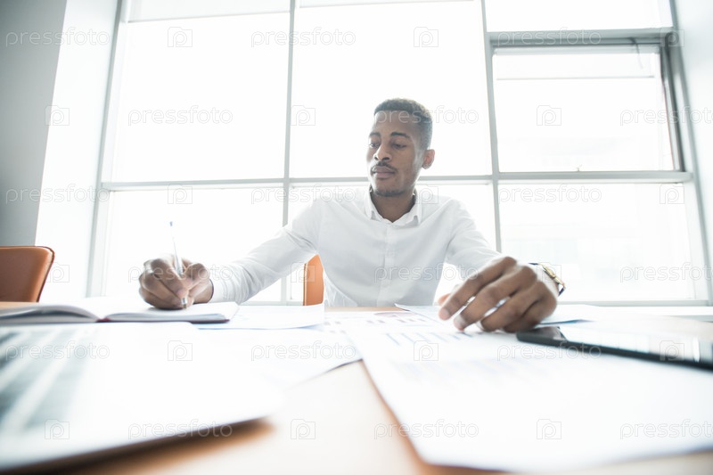 Загруженный африканский менеджер делает бизнес-анализ